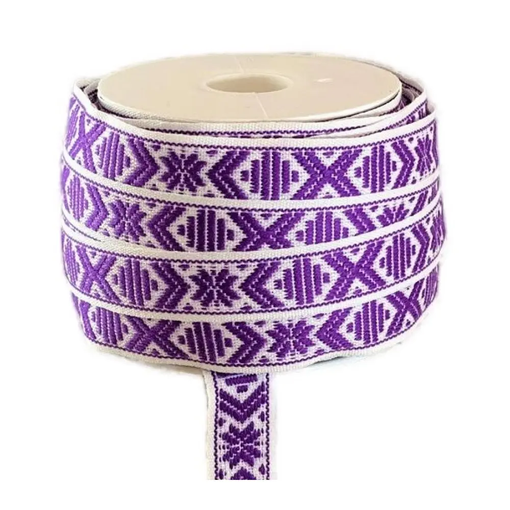 Dessa bomullsband, 15 mm breda, är vävda i Småland av ekologisk bomull, innehållande 85% bomull och 15% polyester. Inspirerade av nordiska folkdräkter, ger de en autentisk och tidlös stil till dina projekt.