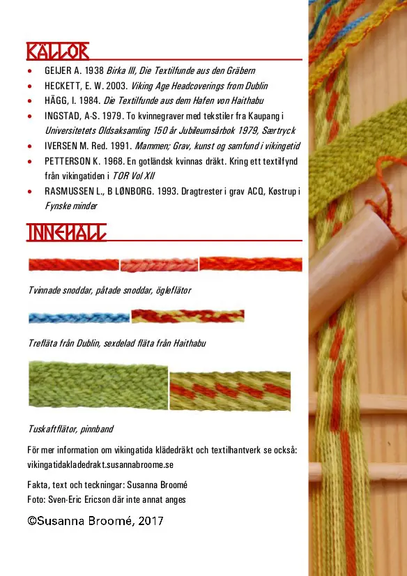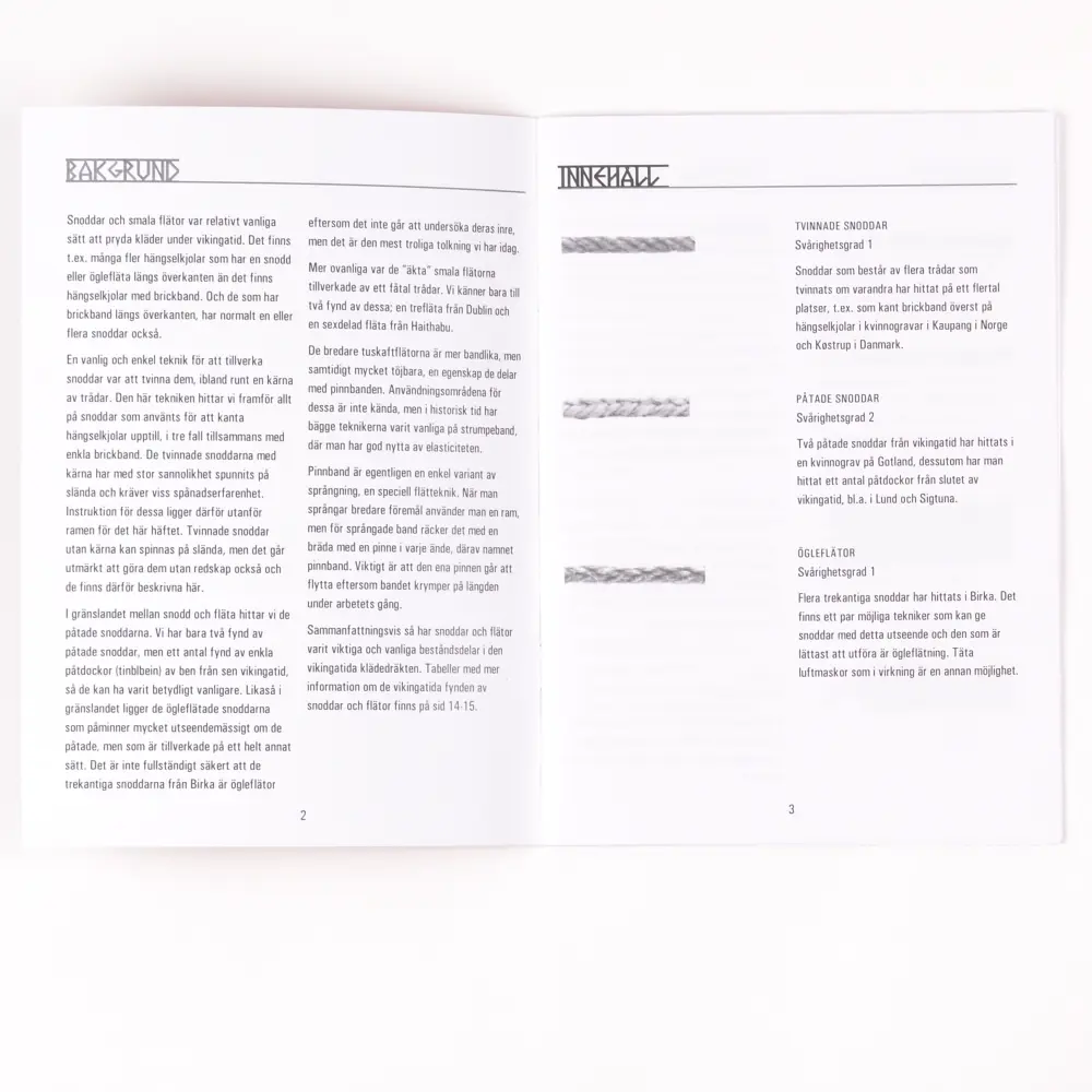 Detta tryckta häfte ger dig instruktioner för att skapa autentiska snoddar och flätor som användes under vikingatiden, perfekta för dekoration eller som funktionella föremål som strumpeband. Alla mönster och tekniker baseras på arkeologiska fynd från vikingatiden.