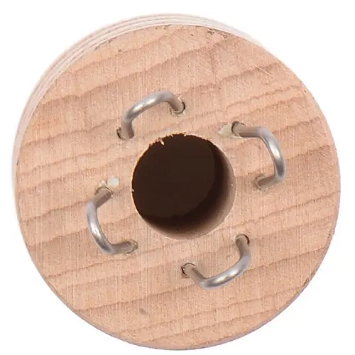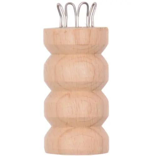 Påtdocka/sticklisa tillverkad i ljust trä med fyra stycken metallöglor för påtning av ihåliga, stretchiga garnsnoddar. Att påta snoddar och snören av garn är en gammal teknik som till utseendet påminner lite om stickning, men utförs med hjälp av en virknål genom att flytta garntrådarna mellan de olika öglorna.