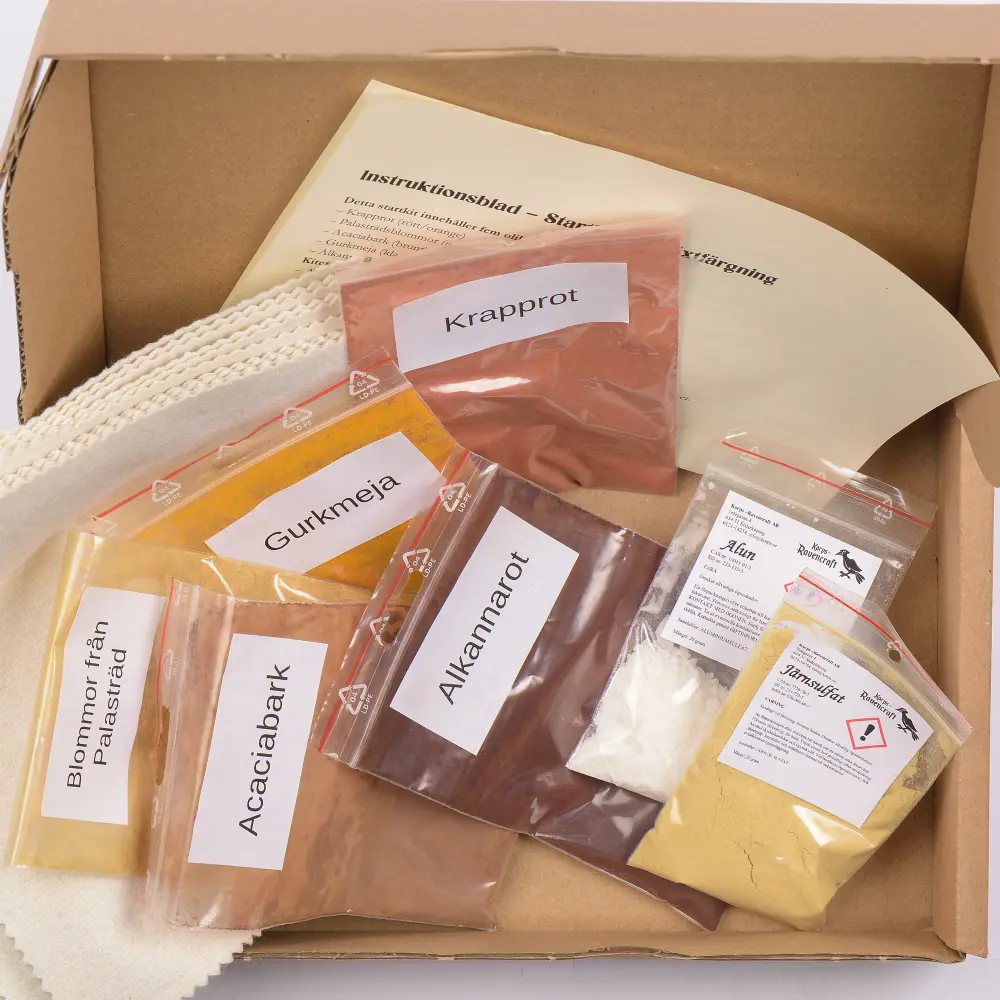 Vill du prova flera färger och verkligen fördjupa dig i växtfärgning? Vårt Startkit för växtfärgning – Flera färger (multikit) för nybörjare är ett komplett och inspirerande kit för dig som vill utforska naturens färgpalett och lära dig grunderna i naturlig färgning.