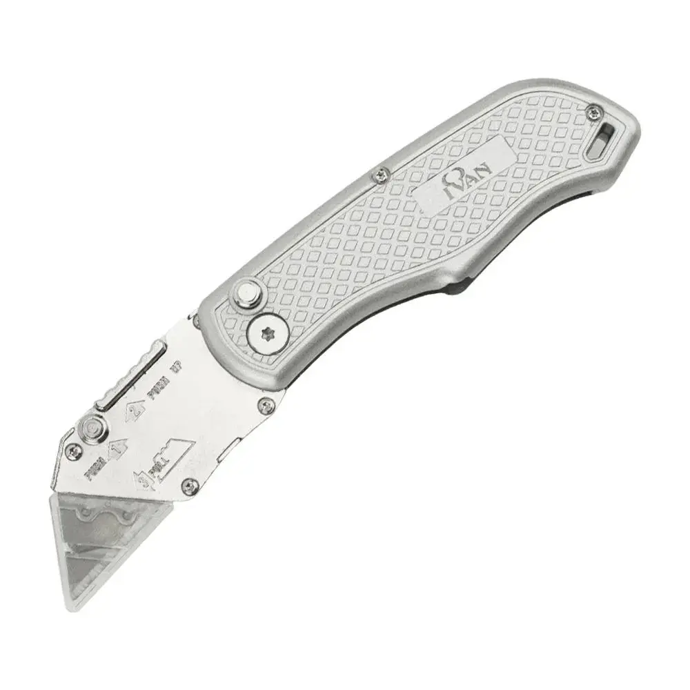 Denna hopfällbara universalkniv är ett mångsidigt verktyg för läderhantverk och andra kreativa projekt. Med sin praktiska design som inkluderar en bältesklämma, är den lätt att bära med sig och erbjuder snabb access under arbete.