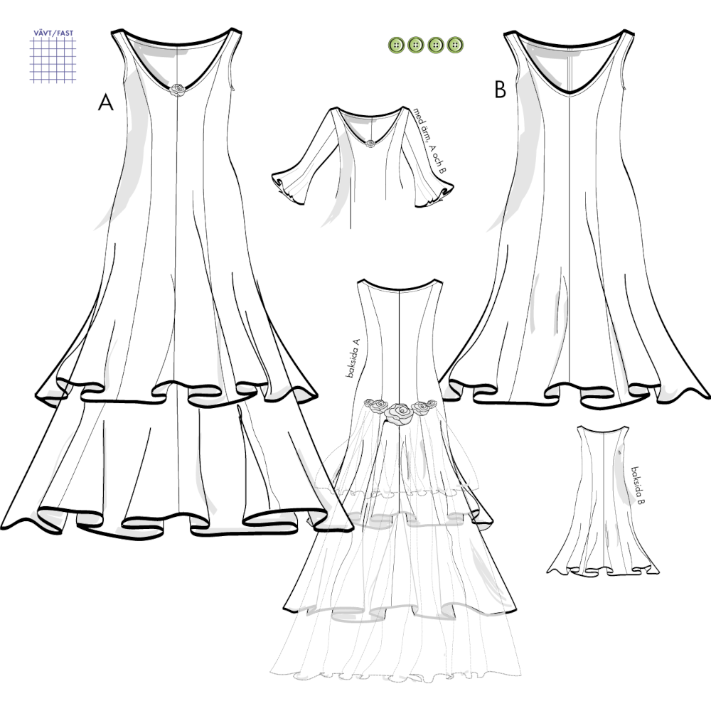 - Modell B: Klänning i knälängd, fodring rekommenderas för transparenta tyger. Längd enligt mönstret är cirka 100 cm.
