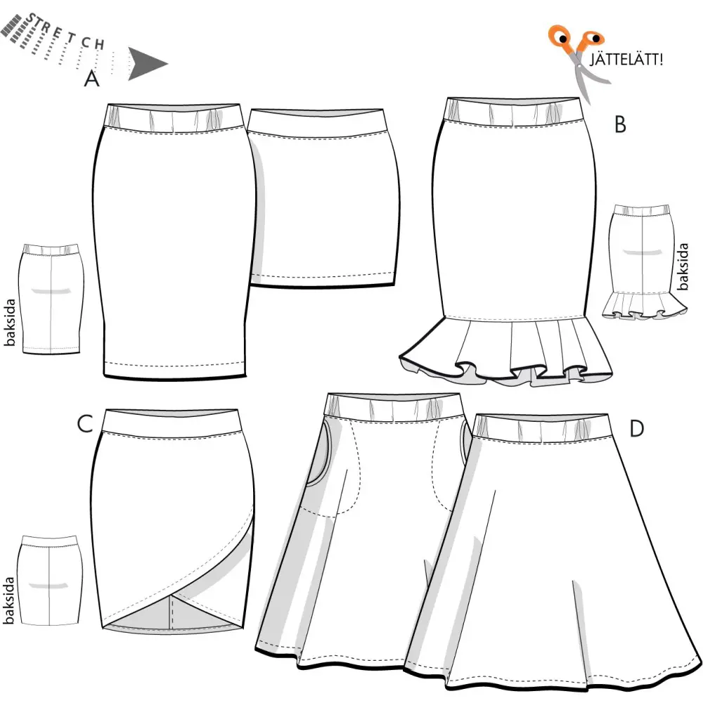 Dessa kjolar är perfekta för stretchigt trikåtyg och är idealiska för alla tillfällen. De är enkla att sy och erbjuder en bekväm passform tack vare den breda linningen.