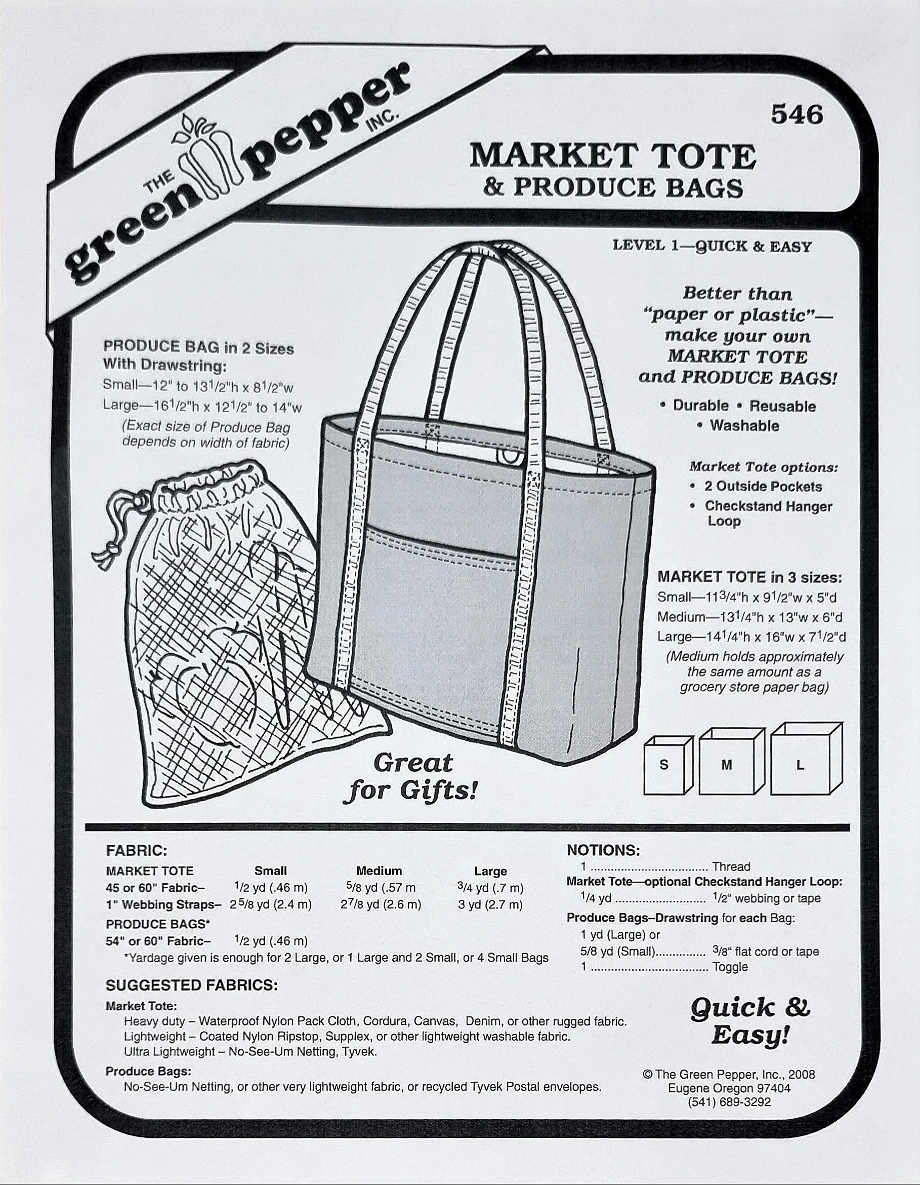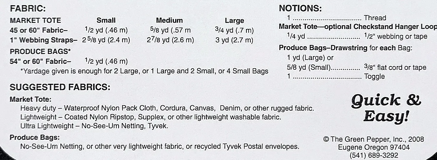 Sy praktiska och miljövänliga tygväskor med detta mönster. Skapa en frukt- och grönsakspåse i linnetyg eller en shoppingkasse i bomullscanvas. Fodertyger i viskos är perfekta för insidan, och vackra band kan användas som bärhandtag för att ge extra stil.